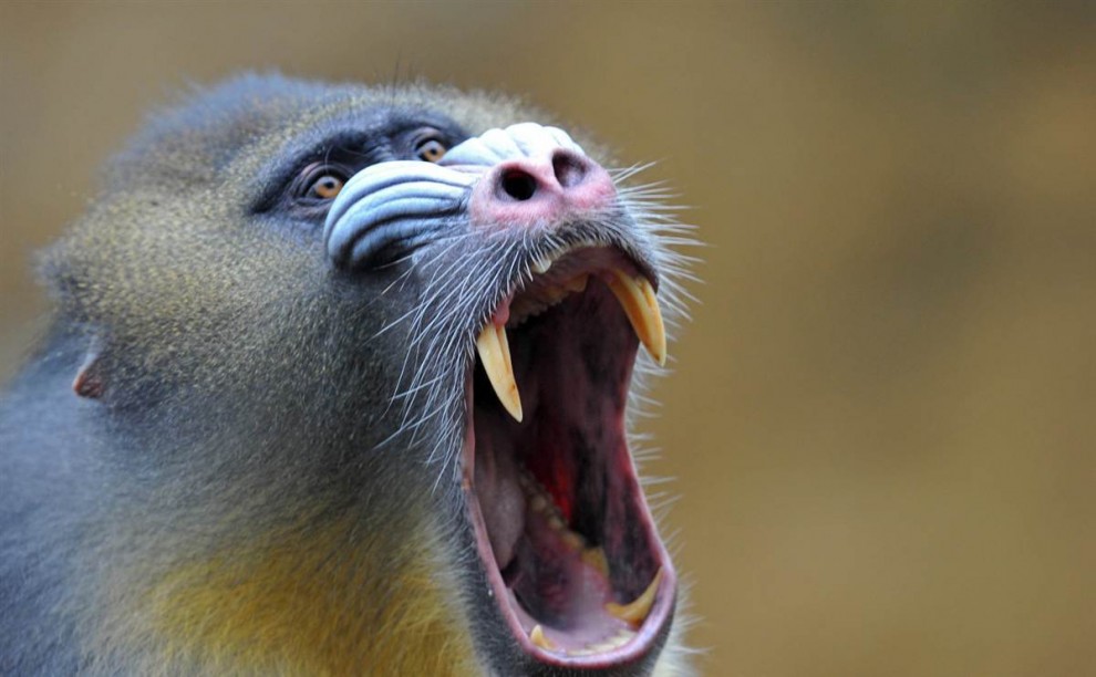 Окрас мандрилов — один из самых ярких и разноцветных среди приматов и вообще млекопитающих. Костные борозды, тянущиеся вдоль носа, окрашены в голубой или синий цвет. Нос — ярко-красный, по бокам лица и борода — из белых, желтоватых, иногда оранжевых, волос. Шерсть на туловище и в задней части головы — от бурой до тёмно-коричневой. Цвет кожи на ягодицах — от красно-синего до голубого, иногда фиолетовый. Самки окрашены намного бледнее